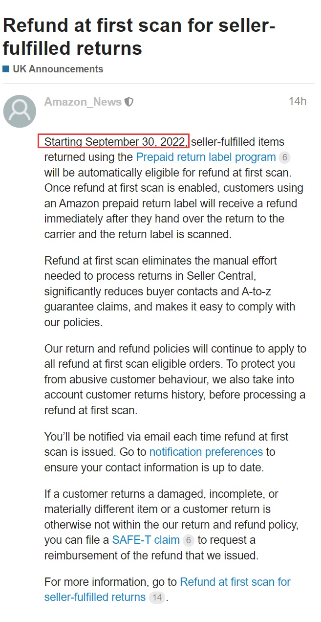 9月30日生效的退货和退款政策将继续适用于所有符合条件的首次扫描订单退款。为了保护卖家免受买家滥用行为的影响,亚马逊还会在首次扫描处理退款之前查询买家退货历史。