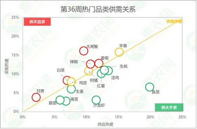 分析惠农网平台热门品类的供需关系:大闸蟹、辣椒、甘蔗、白菜和葡萄的供应相对偏紧;鱼苗、小龙虾、猪苗、鹅苗、活鸡、红薯、生蚝和生姜的供应相对充足;而苹果、柑橘和鸡苗则是供需相对稳定的品类。