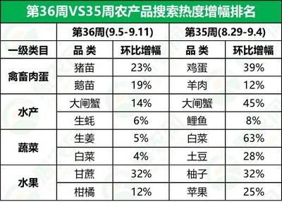 市场热门搜索品类的热度增幅方面,第36周,甘蔗热度大幅攀升32%,成为热度增幅最大的品类。
