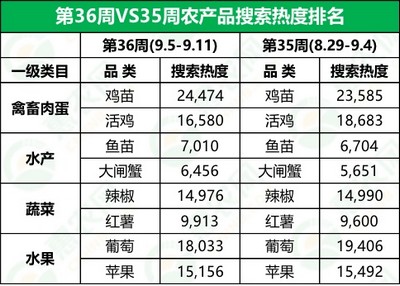据惠农网平台对禽畜肉蛋、水产、蔬菜和水果4大农产品类目的重点监测与追踪,第36周,4大农产品类目排名前2位的品类均与上周相同,但热度有不同程度的变化:鸡苗、鱼苗、大闸蟹和红薯热度有所上升,活鸡、葡萄和苹果热度下降,辣椒热度则比较平稳。