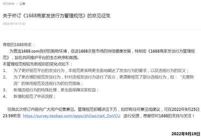 9月19日消息,1688平台今日发布关于修订《1688商家发货行为管理规范》的意见征集(以下简称公告)。