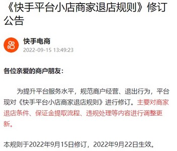 9月19日消息,快手电商近日发布公告称,为提升平台服务水平,规范商户经营、退出行为,平台现对《快手平台小店商家退店规则》进行修订。主要对商家退店条件、保证金提取流程、违规处理等内容进行调整更新,规则于2022年9月22日生效。