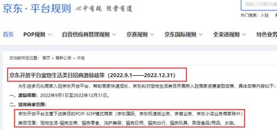 9月19日消息,京东近日发布京东开放平台宠物生活类目招商激励政策,主要面向2022年9月1日至2022年12月31日宠物生活类目新入驻商家。