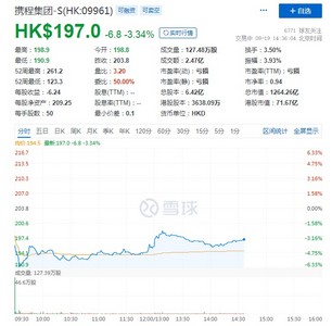 截至9月19日14:36,携程每股报价197.0港元,跌3.34%,成交量127.48万股,成交额2.47亿,总市值1264.26亿港元。