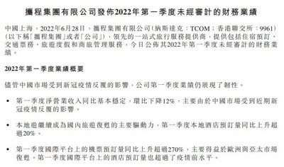另外,携程集团此前宣布将于2022年9月19日举行会议,藉以(其中包括)批准该公司之截至2022年6月30日止三个月及六个月的财务业绩及其刊发,并将于2022年9月22日在香港联交所交易时间之前公布业绩。