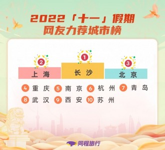 “十一”假期前,同程旅行发起“畅游国庆提前订”活动,发动网友推荐喜欢的旅行城市,截至9月15日,长沙位列网友力荐城市榜首位。茶颜悦色、臭豆腐等美食和岳麓山、橘子洲等知名景点成为用户推荐长沙的主要理由。
