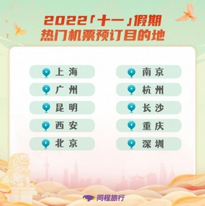 截止9月16日,国内机票预订排名前十的目的地分别为上海、广州、深圳、昆明、重庆、西安、北京、南京、杭州、长沙。与此同时,同程旅行将在国庆前夕提前返场消消卡产品,为有乘机计划的用户节省更多成本。