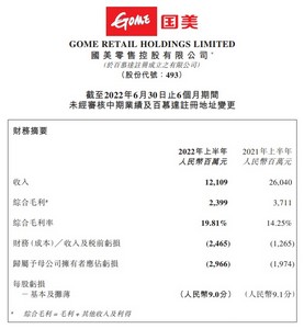 8月31日,国美零售公布了2022年的中期业绩。报告期内,国美零售收入121.09亿元,同比下降53.46%;税前亏损24.65亿元,去年同期亏损12.65亿元;归属于母公司拥有者应占亏损29.66亿元,去年同期应占亏损19.74亿元。