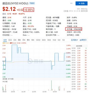 同时,蘑菇街涨近1%,报2.12美元,总市值1762.50万美元。