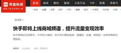 值得一提的是,据界面新闻报道,快手即将上线商城频道,商城页面和淘宝、京东类似,用户可通过搜索或者快手APP首页的一级入口进入。