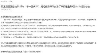 阿里国际站日前还发布2022年“十一国庆节” 期间信用保障交易订单极速退款规则时效调整公告,北京时间2022年9月29日00:00:00 至 2022年10月8日23:59:59期间,当买家提交或修改退款申请时,在待卖家响应环节(包括首轮和多轮响应),响应时效由原来的5个自然日延长至10个自然日,买家响应时效不做调整。