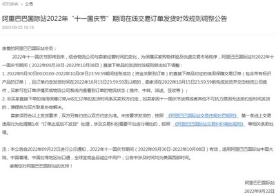 公告称,2022年十一国庆节即将到来,结合物流公司与卖家经营时间的变化,为保障买家购物体验及快速交易市场秩序,阿里巴巴国际站对2022年十一国庆节期间(2022年9月30日-2022年10月8日)直接下单品的发货时效规则做出如下调整。