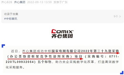 另据了解,齐心集团近日还成功中标国家电网有限公司2022年第三十九批采购(办公类物资框架竞争性谈判采购)项目(采购编号:0711-220TL09932054)五个标包,助力央企采购数字化改革,打造高效数字化采购服务。