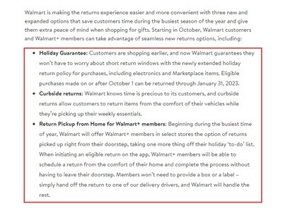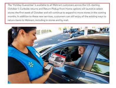 需要注意的是,从10月1日开始,美国所有沃尔玛客户均可享受“假日保证”。路边退货和上门取货选项将于10月的第一周在指定商店推出,并将在未来几个月内继续扩展到更多商店。除了这些新服务之外,客户仍然可以享受所有现有的将商品退回沃尔玛的方式,包括在商店和邮寄。