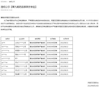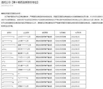 9月22日消息,阿里国际站今日发布违规公示【第十期药品禁限售专题】(以下简称公告)。