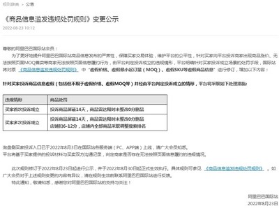 阿里国际站近日还发布《商品信息滥发违规处罚规则》变更公示,针对买家向平台投诉商家出现商品涨价、无法按照页面MOQ售卖等商家无法按照页面信息履约行为,由平台判定投诉成立的违规情形,平台明确针对买家投诉成立场景的处罚手段,国际站将对原《商品信息滥发违规处罚规则》中“虚假价格、虚假最小起订量(MOQ)、虚假SKU等虚假商品信息”进行修订。