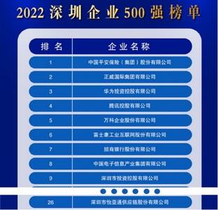 日前,深圳市企业联合会、深圳市企业家协会正式发布“2022深圳企业500强榜单”及《2022深圳500强企业发展报告》。其中,深圳市怡亚通供应链股份有限公司位列榜单第26位,怡亚通第一大股东——深圳市投资控股有限公司位列第9位。