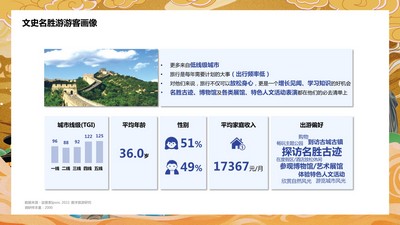 从游客画像上来看,文史名胜类游客更多来自低线城市,四线、五线城市偏多,平均年龄为36岁;且男女性别较为均衡,女性游客比例为51%,男性游客比例为49%;平均家庭收入为17367元每月;在出游偏好上,以探访名胜古迹、参观博物馆/艺术展馆、体验特色人文活动、到访古城古镇等最为突出。