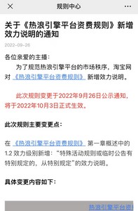 公告称,为了规范热浪引擎平台的市场秩序,淘宝网对《热浪引擎平台资费规则》新增效力说明。此次规则变更于2022年9月26日公示通知,将于2022年10月3日正式生效。