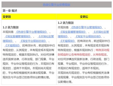 具体来看,变更后,本规则是《热浪引擎平台管理规则》、《淘宝直播管理规则》、《点淘社区管理规则》、《淘宝平台规则总则》、《天猫规则》的有效补充,前述规则中已有规定的,从其规定,未有规定或本规则有特殊规定的,根据本规则执行;特殊活动规则或临时公告有特别规定的,从特别规定。对任何涉嫌违反国家法律、行政法规、部门规章、平台规则、平台协议等规定的行为,本规则已有规定的,适用于本规则。本规则尚无规定的,平台有权根据相关法律法规规章、平台规则及与平台签订的各项协议酌情处理。