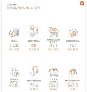 根据小米集团2022年中期报告,今年上半年,小米集团收入达1435亿元人民币,期间经调整净利润为49亿元人民币。其中智能手机收入为880亿元人民币,互联网服务收入为141亿人民币,境外收入占总收入49.8%。
