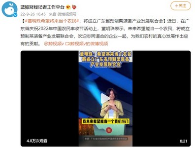 她表示,格力将发起筹建广东省预制菜装备产业发展联合会。据介绍,广东省预制菜装备产业发展联合会由格力电器携手广东省农科院、广东恒兴集团、国联水产、温氏集团、钱大妈、京东物流等单位共同筹建。