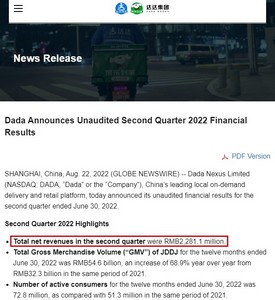 今年8月,达达集团公布了公司截至2022年6月30日止的2022年第二季度财报。财报显示,达达集团第二季度总营收为22.811亿元,同比增长55%;归属于普通股股东的净亏损为5.788亿元,去年同期为亏损6.404亿元,同比有所收窄。