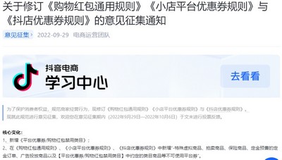 9月29日消息,抖音电商发布公告称,为了保护消费者权益,规范商家经营行为,现修订《购物红包通用规则》《小店平台优惠券规则》与《抖店优惠券规则》。现就此规范进行意见征集,用户可在意见征集期内(2022年9月29日—2022年10月6日)进行投票反馈。