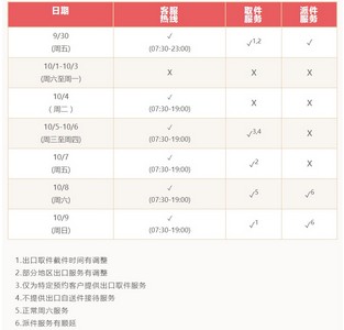 另外,10月7日,UPS的取件服务部分地区出口服务有调整,不提供派件服务。10月8日,UPS的取件服务为正常周六服务,派件服务有顺延。10月9日,UPS的取件服务出口取件截件时间有调整,派件服务有顺延。