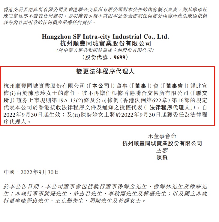 10月7日消息,顺丰同城近日发布公告称,杭州顺丰同城实业股份有限公司董事会谨此宣布,由于陈蕙玲女士的辞任,彼不再担任法律程序代理人,自2022年9月30日起生效;及陈诗婷女士将于2022年9月30日起获委任为法律程序代理人。