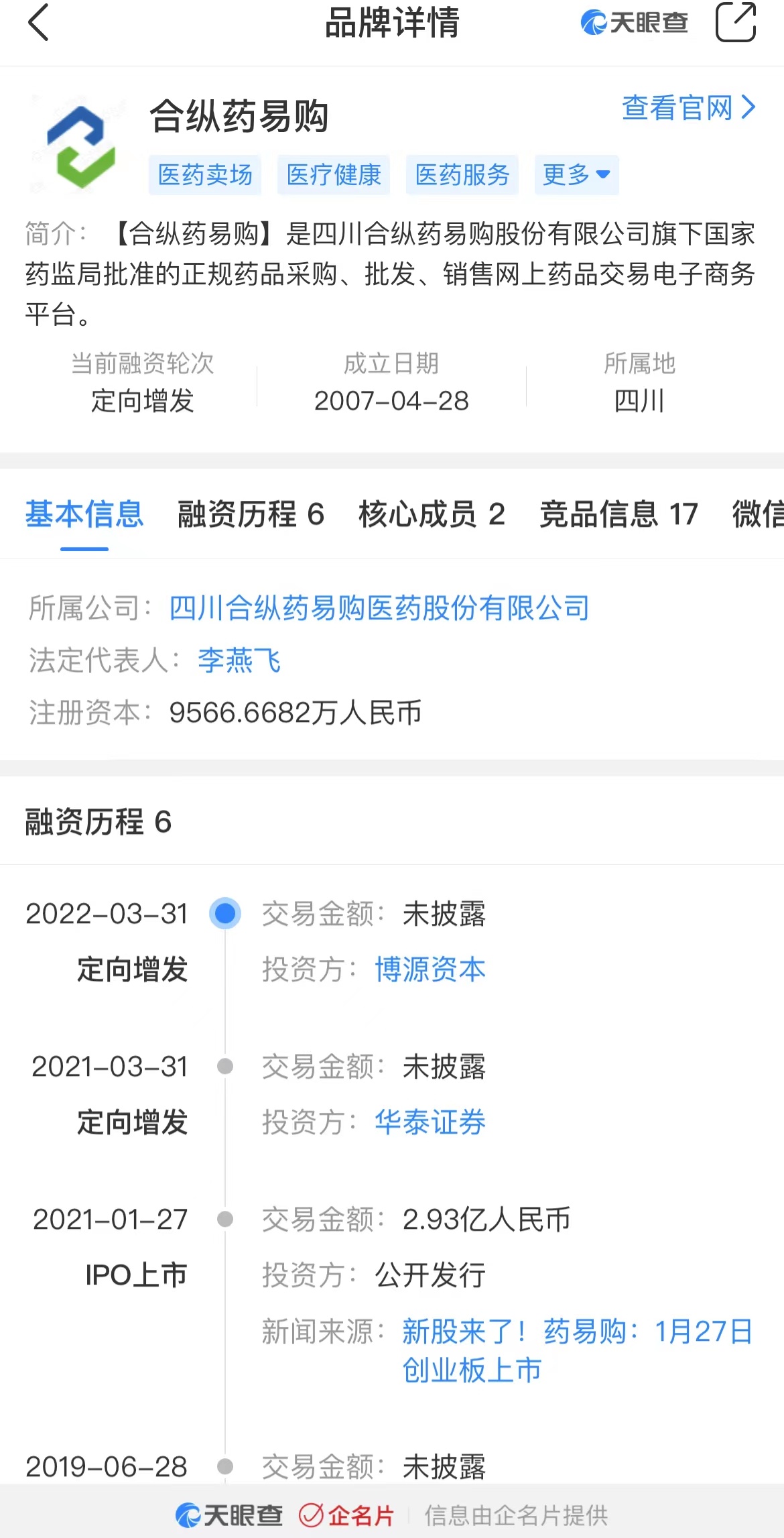 天眼查资料显示,合纵药易购是四川合纵药易购股份有限公司旗下国家药监局批准的正规药品采购、批发、销售网上药品交易电子商务平台。