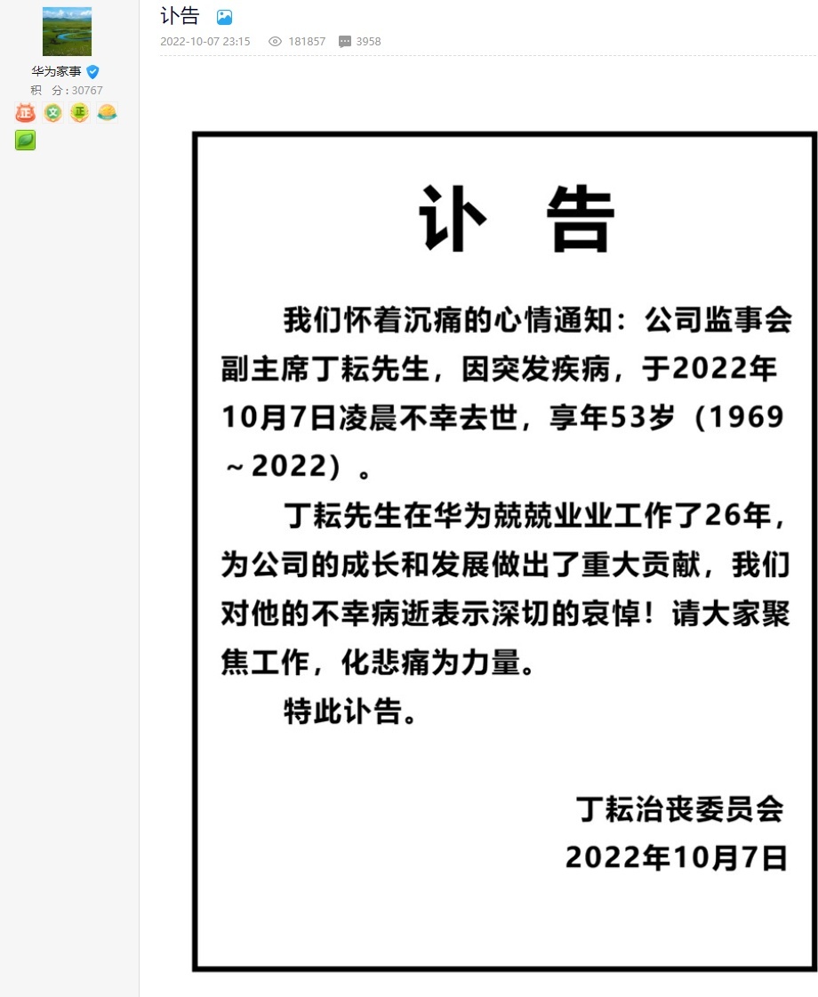 讣告显示,“丁耘先生在华为工作了26年,为公司的成长和发展做出了重大贡献,我们对他的不幸病逝表示深切的哀悼!请大家聚焦工作,化悲痛为力量。”
