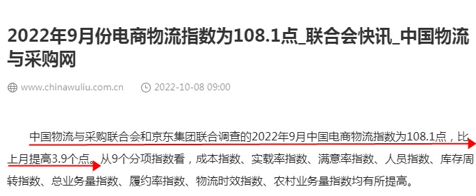 10月8日消息,中国物流与采购联合会和京东集团联合调查的2022年9月中国电商物流指数今日公布。数据显示,2022年9月中国电商物流指数为108.1点,比上月提高3.9个点。
