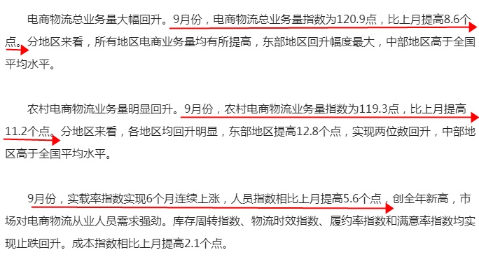 具体来看,9月份,电商物流总业务量指数为120.9点,比上月提高8.6个点。分地区来看,所有地区电商业务量均有所提高,东部地区回升幅度最大,中部地区高于全国平均水平。