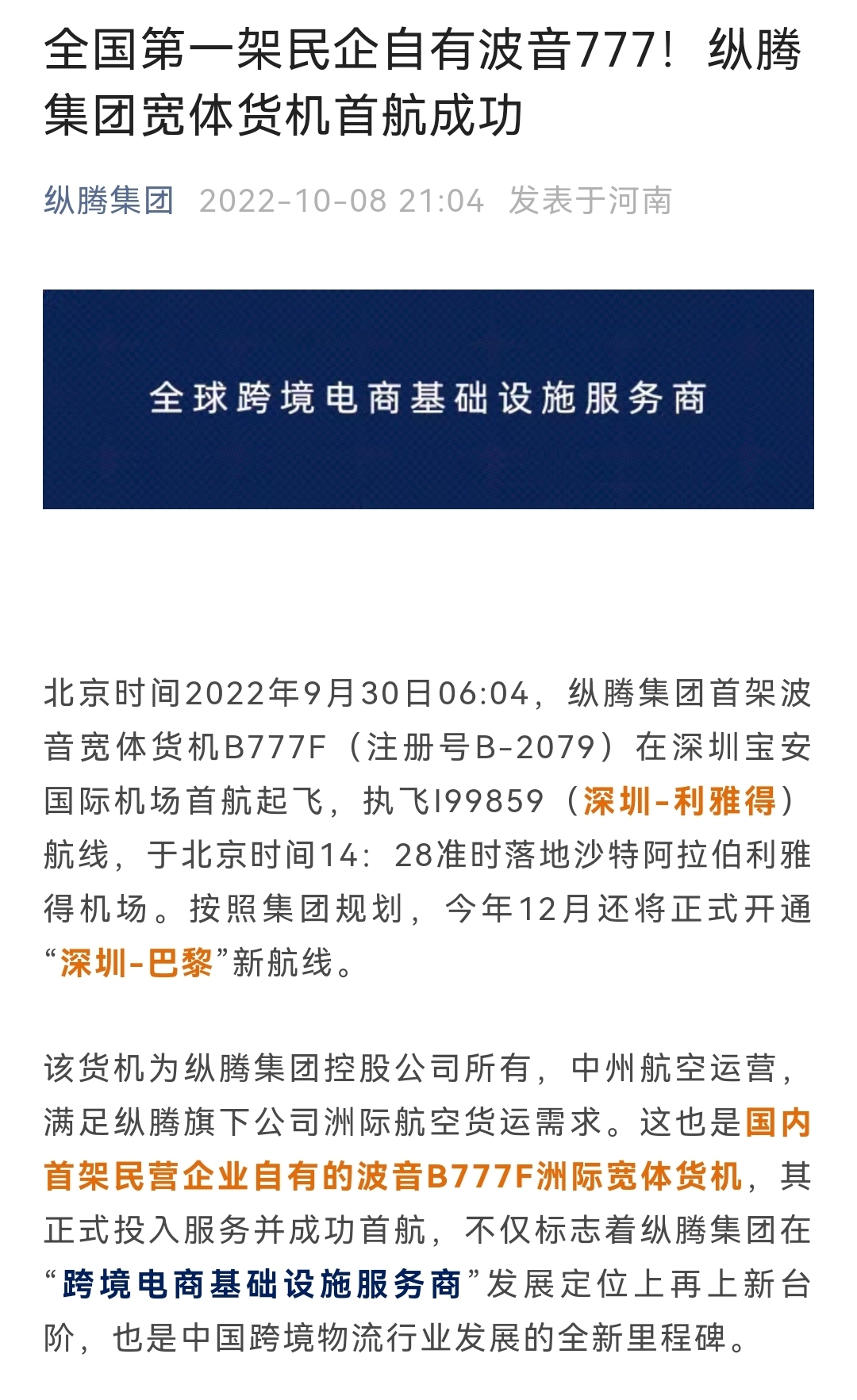 该货机为纵腾集团控股公司所有,中州航空运营,满足纵腾旗下公司洲际航空货运需求。这也是国内首架民营企业自有的波音B777F洲际宽体货机,其正式投入服务并成功首航,标志着纵腾集团在“跨境电商基础设施服务商”发展定位上再上新台阶。