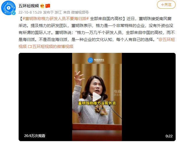10月9日消息,格力电器董事长董明珠近日在接受媒体采访时谈到研发团队,她表示,格力是非常特殊的一个企业,没有外资、没有外国所谓的国际人才,格力所有的一万几千个研发人员全部来自于中国的高校,而不是“海归派”。