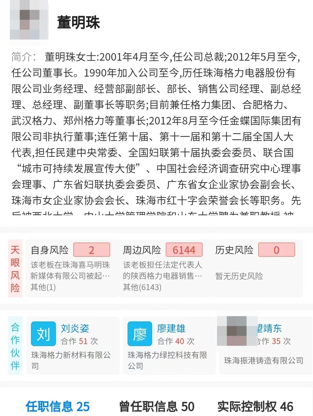 天眼查资料显示,董明珠,2001年4月至今任公司总裁,2012年5月至今任公司董事长。