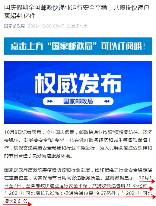 值得关注的是,日前,据国家邮政局援引中国邮政快递报社消息,监测数据显示,10月1日至7日,全国邮政快递业运行安全平稳,共揽收快递包裹21.35亿件,与2021年同比增长7.23%;投递快递包裹19.67亿件,与2021年同比增长2.61%。