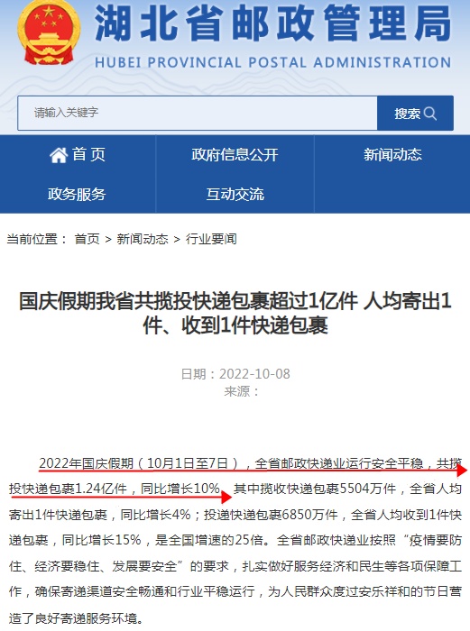 另外,湖北省邮政管理局日前也发布消息称,2022年国庆假期(10月1日至7日),湖北省邮政快递业运行安全平稳,共揽投快递包裹1.24亿件,同比增长10%。其中揽收快递包裹5504万件,全省人均寄出1件快递包裹,同比增长4%;投递快递包裹6850万件,全省人均收到1件快递包裹,同比增长15%,是全国增速的25倍。