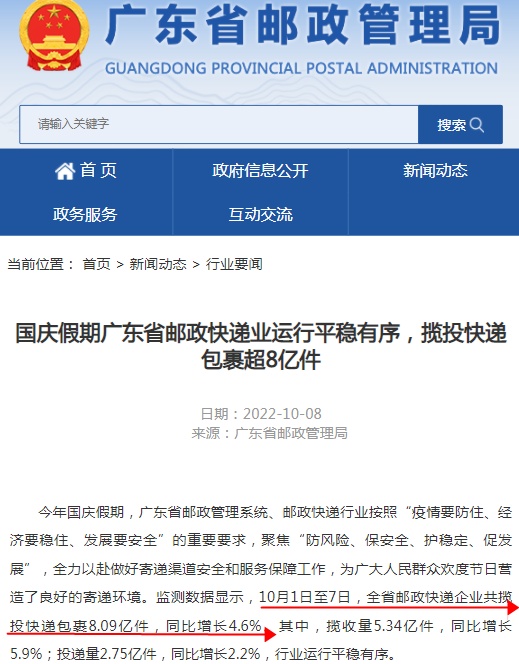 国庆期间广东省揽投快递包裹超8亿件 同比增长4.6%