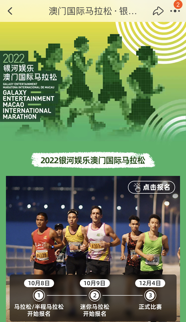 10月9日消息,由澳门特别行政区体育局及澳门田径总会主办的“2022银河娱乐澳门国际马拉松”今日正式开启报名。作为“2022银河娱乐澳门国际马拉松”赛事官方合作伙伴,飞猪联合澳门体育局上线“澳门国际马拉松”主题活动,推出专属补贴。