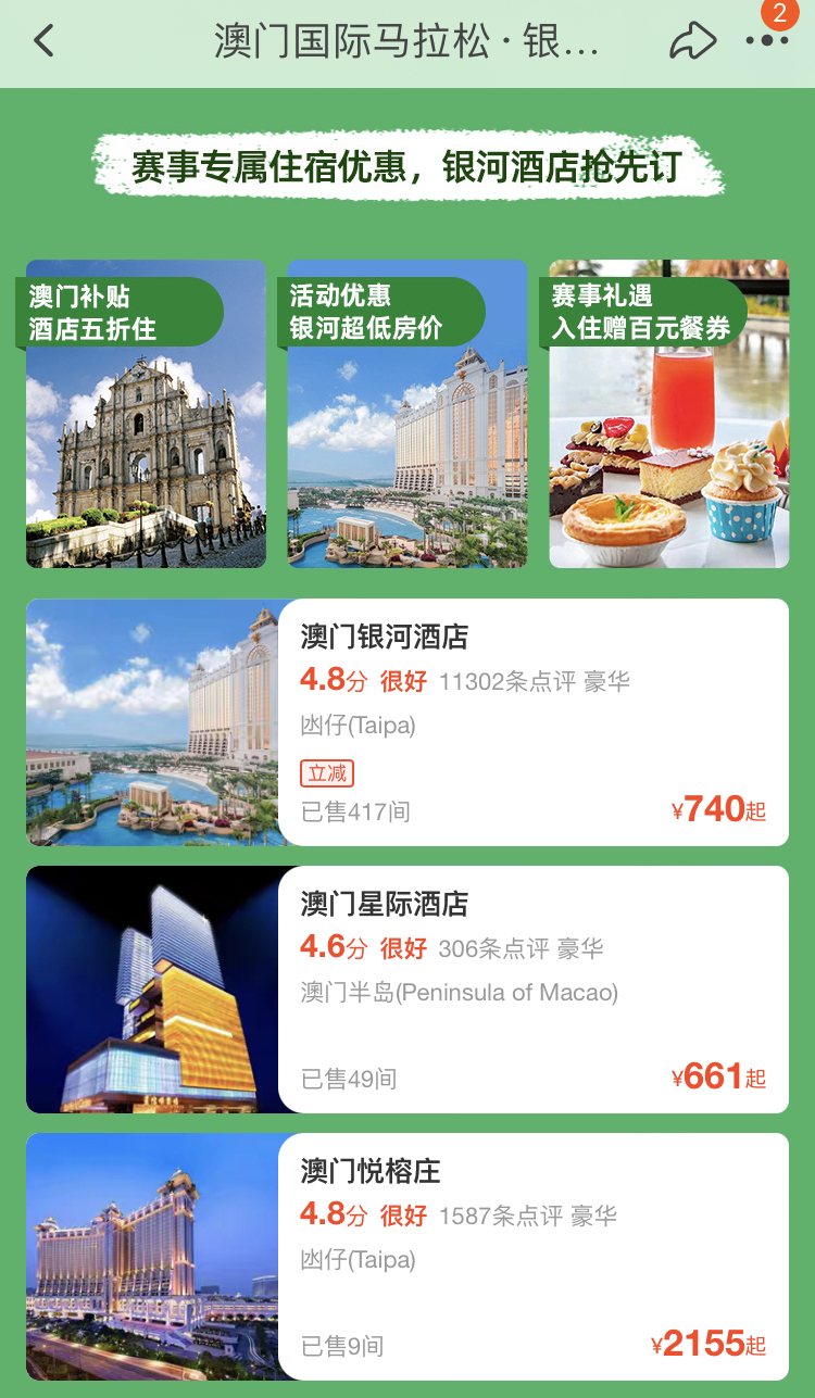 据了解,该赛事将于2022年12月4日举行,报名名额为马拉松1400名、半程马拉松4800名、迷你马拉松5800名。消费者在飞猪上预订赛事期间(12月2日-12月6日)澳门银河酒店、澳门星际酒店、澳门悦榕庄的房间,选择2晚、3晚连住,即可享受低于官方200-450澳门元不等的专属优惠,并获赠餐券等免费权益。