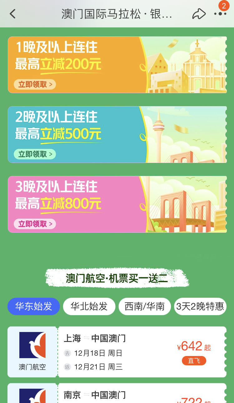 同时,覆盖当地全量酒店的“澳门酒店5折券”,澳门航空往返澳门机票买一送一、买一送二等活动也在飞猪持续开展。