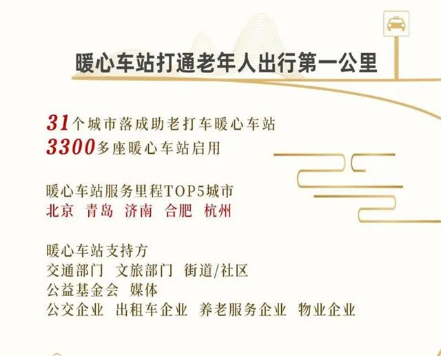 目前,助老暖心出行计划正呈现多点开花、多方合作、多样服务的“三多”趋势。除了北上广深等一线城市之外,河北保定、河南商洛等城市,都对出租汽车即停点、公交站点等进行了数字化升级,增设助老打车服务。四川省成都市大邑县基于文旅场景,在县域内的交通枢纽和主要景区,全面配备助老打车暖心车站,打造县域文旅助老出行试点。