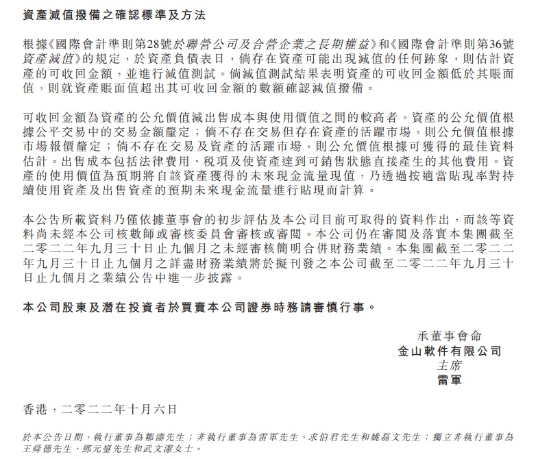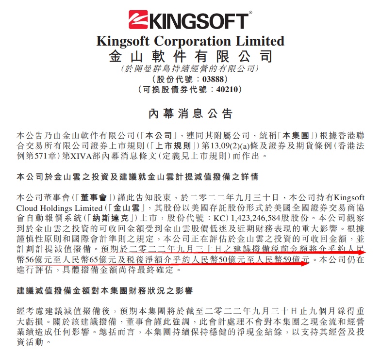 10月9日消息,小米集团创始人、金山软件董事长雷军近日签发一则公告,公司正评估对金山云的投资金额,受其股价低迷及近期财务表现的重大影响,截至9月30日,预计或产生56亿元-65亿元的减值拨备,具体金额待定。