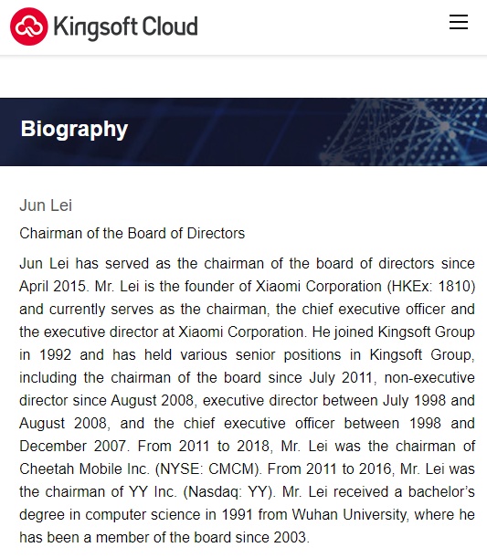 雷军,自2015年4月起担任金山云董事会主席,是小米公司的创始人,目前担任小米公司的主席、行政总裁和执行董事。他于1992年加入金山软件集团,并在金山软件集团担任多个高级职务,包括2011年7月起担任董事长,2008年8月起担任非执行董事,1998年7月至2008年8月担任执行董事,1998年至2007年12月担任首席执行官。2011年至2018年,雷军担任猎豹移动股份有限公司董事长。2011年至2016年,雷军担任YY股份有限公司董事长。