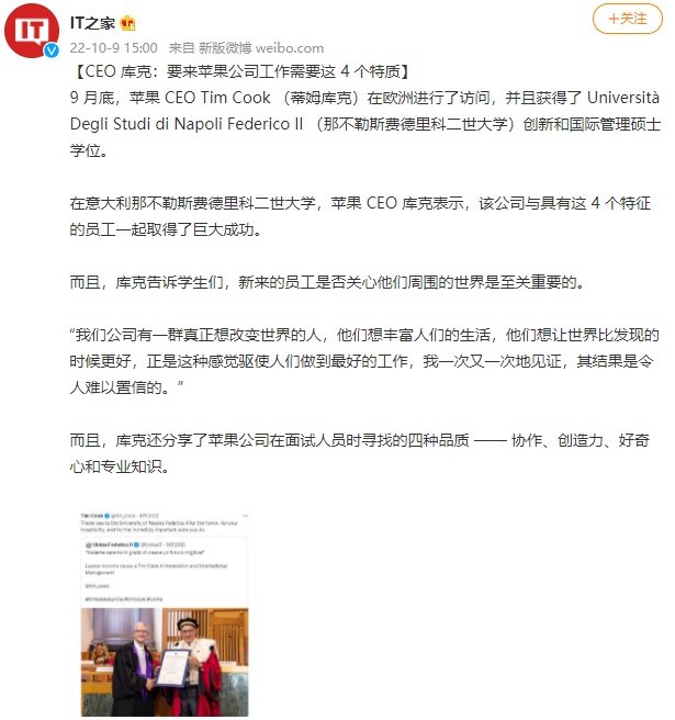 10月9日消息,媒体报道称,9月底,苹果首席执行官(CEO)Tim Cook(蒂姆·库克)在欧洲进行了访问,并且获得了Università Degli Studi di Napoli Federico II(那不勒斯费德里科二世大学)创新和国际管理硕士学位。