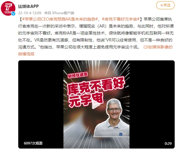 另值得一提的是,近日,库克在一次新的采访中表示,增强现实(AR)是未来的趋势,与此同时,他对所谓的元宇宙则不看好。