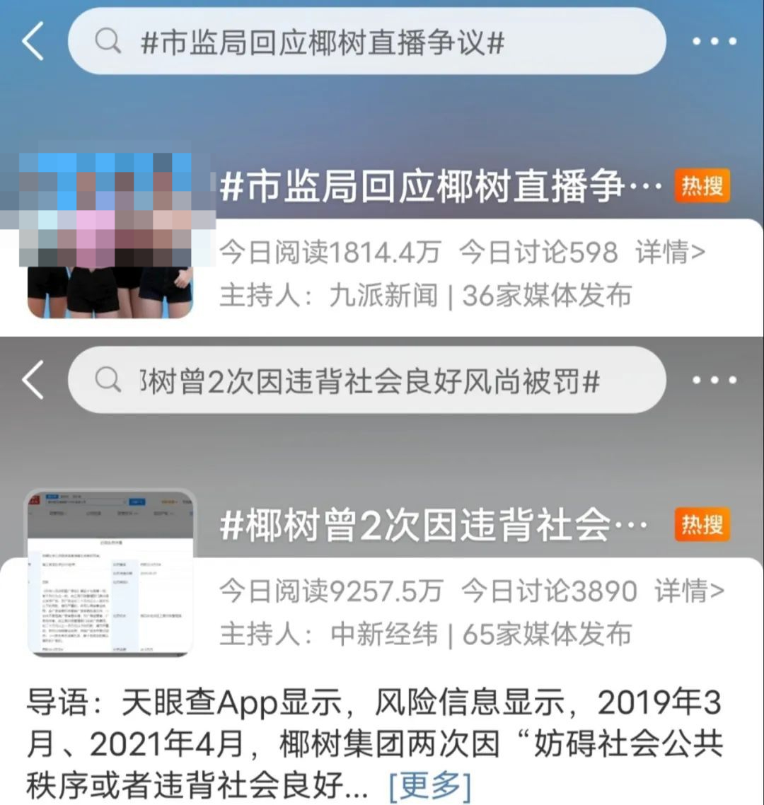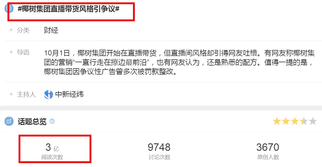 除了在抖音平台之外,这起翻车事件更是在微博等社交媒体引起热议,在一天时间内,椰树集团喜提多个热搜。其中#椰树集团直播带货风格引争议#词条,截至目前阅读次数已超过3亿次。