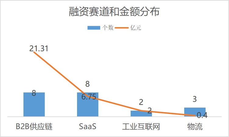 从行业分布来看,B2B供应链赛道有8家企业获得融资,融资总金额为21.31亿元;SaaS赛道获投企业同样为8家,融资总金额为6.75亿元;工业互联网领域获投企业为2家,融资金额为2亿元;物流领域获投企业为3家,融资总金额为0.4亿元。
